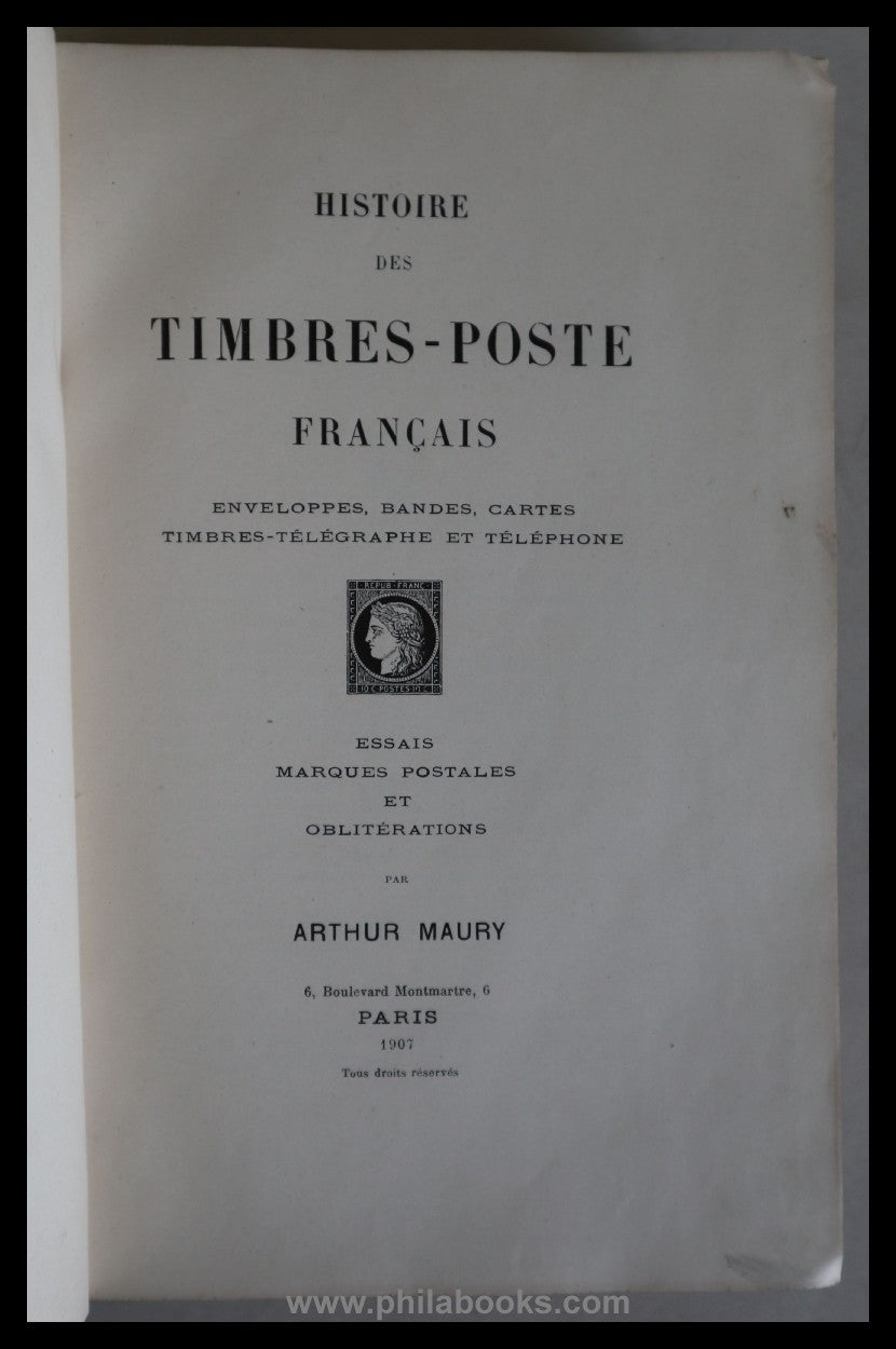 Maury, A., Histoire des Timbres-Poste Francais, Enveloppes, Bandes, Cartes, Timbres-Télgraphe et Téléphone, Essais, Marques Postales et Oblitérations, 1907/08, stamp, postal stationery and stamp handbook, here both parts as a complete edition in full cloth with spine embossing, contains all editions up to 1908, 648 pages with illustrations, very good handbook with many interesting illustrations, with normal signs of age and use without serious defects with firm binding, still in good condition, still a comprehensive reference work today, Crawford 258/1180 #71576