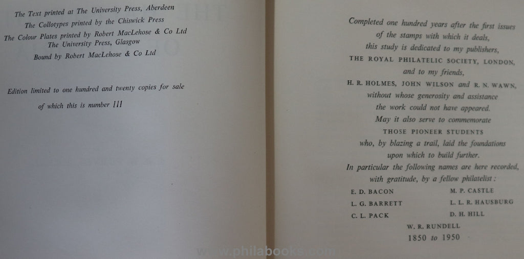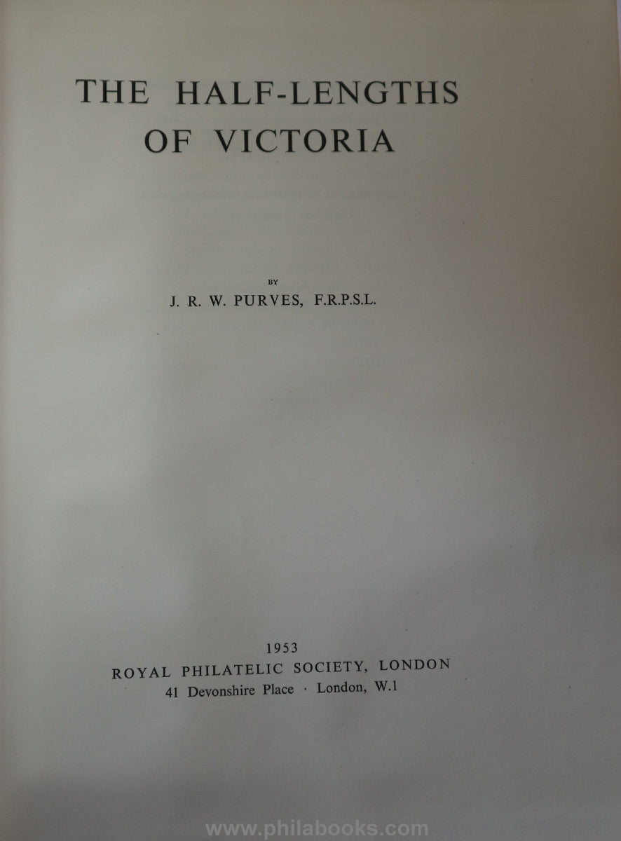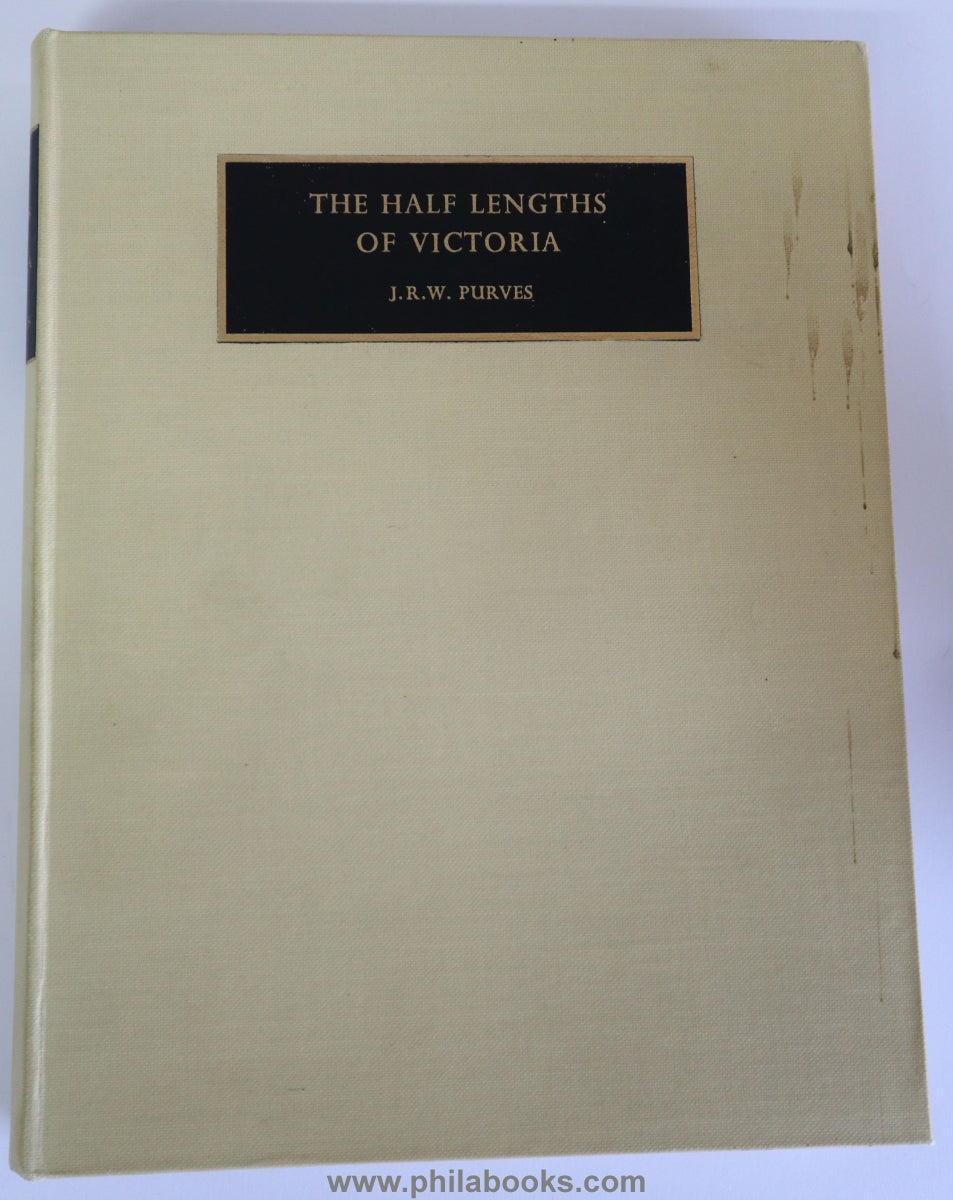 Purves, JRW, The Half Lenghts of Victoria, The Royal Philatelic Society, London, 1953, Handbook of the classic Old Australia edition for the 100th anniversary, XIII pp./216 pp., with one b/w and 4 color plates, full cloth with elaborately incorporated pocket with the plating booklet of the various prints, 31 pp., gold edge at the top, copy 111/150, rare classic by the great Australia expert, cover stained, see scans, also slightly on the top edge of the book, otherwise in good condition #71644