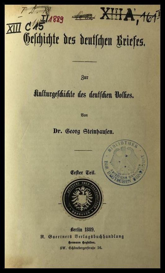 Steinhausen G., History of the German Letter, on the Cultural History of the German People, first part, 1889, 190 pp., bound in half-leather with book corners and spine embossing, very neatly covered in transparent film with library notes on the spine and on the front, ex library of the German Federal Post Office, well preserved, #72132
