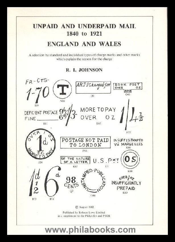 Johnson, R.I., Unpaid and Underpaid Mail 1840-1921, England and Wales, 1982, Katalog der englischen/ walisischen Nachtaxierungsstempel, verlegt bei Robson Lowe, 32 S., viele Abb., druckfrisches Exemplar #100964