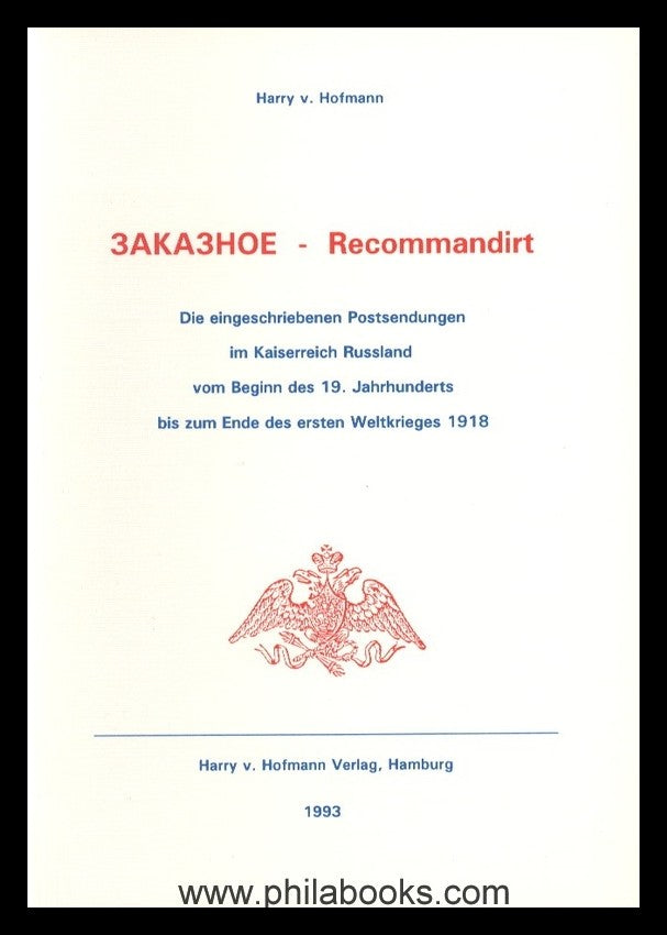 Hofmann, v. H., 3AKA3HOE - Recommandirt, Die eingeschriebenen Postsendungen im Kaiserreich Russland von Beginn des 19. Jahrhunderts bis zum Ende des ersten Weltkrieges 1918, 1993, Handbuch, 320 S. mit zahlreichen Belegabb., druckfrisch. Ausführliche Dokumentation über die Entwicklung des Einschreibewesens und die postalische Handhabung von Einschreibesendungen in Russland seit ca 1810 anhand von unzähligen Belegabbildungen, die erläutert werden sowie anhand von Angaben aus den postalischen Verordnungen. Insbesondere wird dabei auf die unterschiedlichen Einschreibestempel- und die R-Zettel eingegangen. In gesonderten Kapiteln werden die besonderen Verwendungen bei der Feld-,- Bahn,-und Schiffspost sowie die Auslandsverwendungen behandelt. Sehr umfangreich auch das Kapitel über die sogenannten Automaten-Einschreiben. Standardwerk, das in keiner Bibliothek fehlen sollte! Jetzt wegen Verlagsaufgabe zum Sonderpreis lieferbar solange Vorrat reicht, der Original-Verlagspreis war bisher EUR 38! #101780