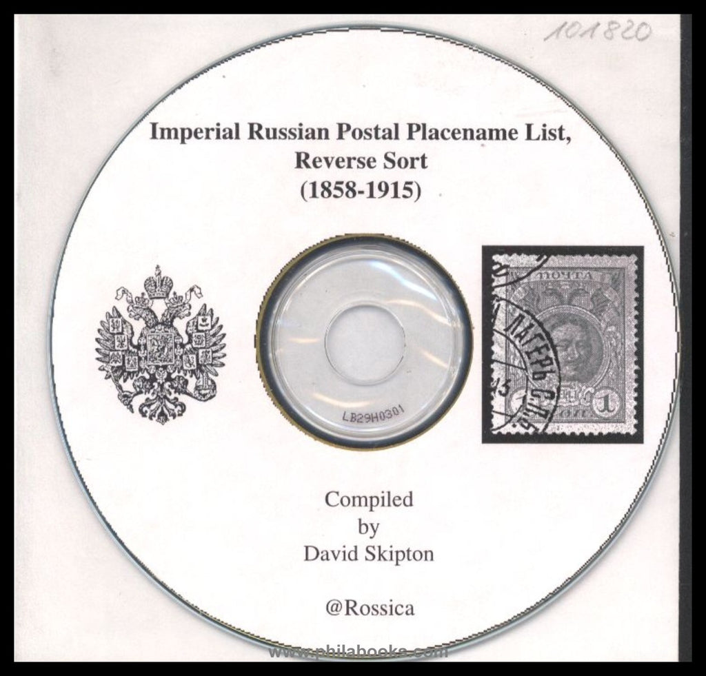 Skipton, Imperial Russian Postal Placename List, Reverse Sort (1858-1915), Postorteverzeichnis mit 18187 Postorten, sortiert alphabetisch nach dem letzten Buchstaben zur Stempelbestimmung, (Rückwärtssortierung) , 379 S., nur erhältlich als CD. Die CD wurde von auf ihre Funktionsfähigkeit überprüft. Das Verzeichnis wird als PDF-Dokument angeboten und kann sofort mit dem auf der CD befindlichen, vorinstallierten PDF-Reader gelesen werden. Vorwort in englisch, das Postorteverzeichnis enthält nur Angaben in russisch. #101820