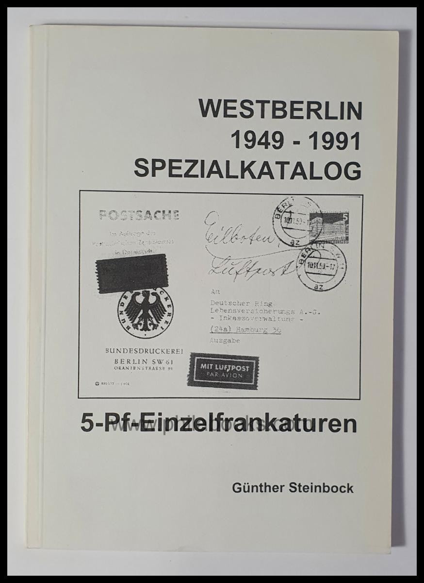 Steinbock, G., Westberlin 1949-1991 Spezialkatalog, 5 Pf-Einzelfrankaturen, 1999, A5, broschiert mit vielen Abb. und mit Bewertungen, nur selten angeboten, hier noch ein druckfrisches Exemplar #102437