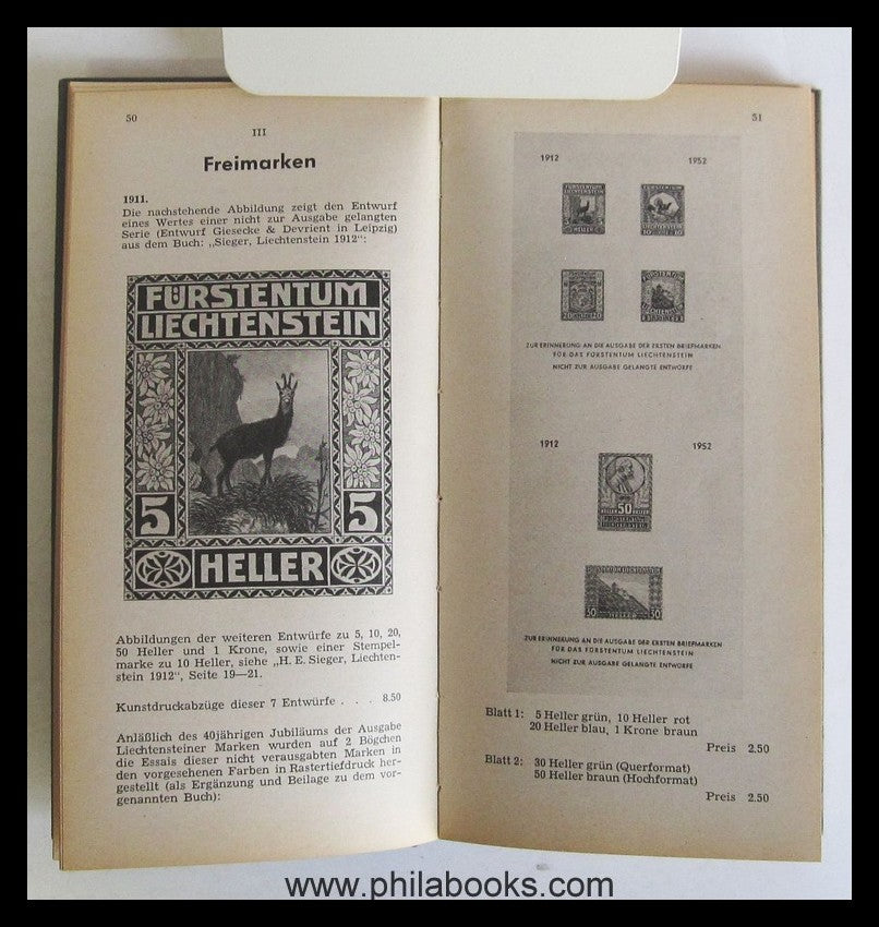 Sieger, Liechtenstein Handbuch und Katalog 1953, 3. Aufl., 272 S., enthält Vorphilatelie, Vor- und Mitläufer Österreich/ Schweiz, Marken, Ganzsachen, Probedrucke, Essais, Stempel, Luft/Zeppelinpost, Feldpost etc., Festeinband, Einband etwas ausgebleicht, ansonsten gutes, offensichtlich unbenutzes Ex., nicht häufig #1233