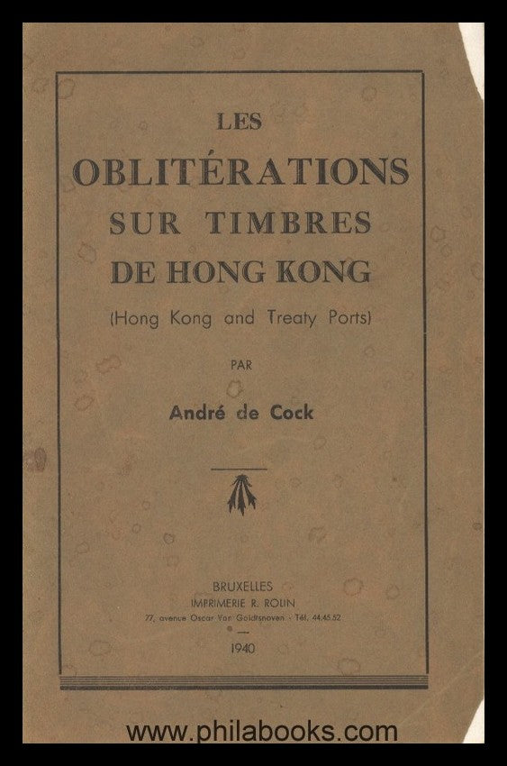 De Cock (André), Les Oblitérations sur Timbres de Hong Kong (Hong Kong and Treaty Ports), Bruxelles, 1940, Kleinformat, broschiert, 28 S., mit Abb., Kunstdruckpapier, selten, Umschlag an 2 Ecken verkürzt, die S 26 und die letzte Seite sind vertauscht und kopfstehend eingebunden de Cock war Kurator des belgischen Postmuseums und ist deutschen Sammlern durch seine Baden-Sammlung bekannt. #1330