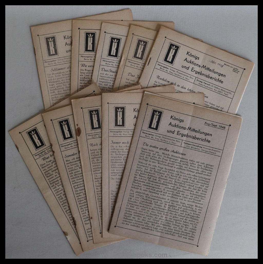 Königs Auktions-Mitteilungen und Ergebnisberichte, Berka ,Kreis Northeim bei Hannover,10 Hefte ab Aug./Sept. 1948 bis Juli/August 1949 kpl.. Enthält hoch-interessante Berichte zu den ANFÄNGEN DER BRIEFMARKENAUKTIONEN NACH DEM KRIEG darunter Berichte über die Morgenbesser-Auktionen, Wilhelmy- Auktion, Heidelberg usw., kurzlebige Publikation, möglicherweise komplett, gut erhalten! #200240