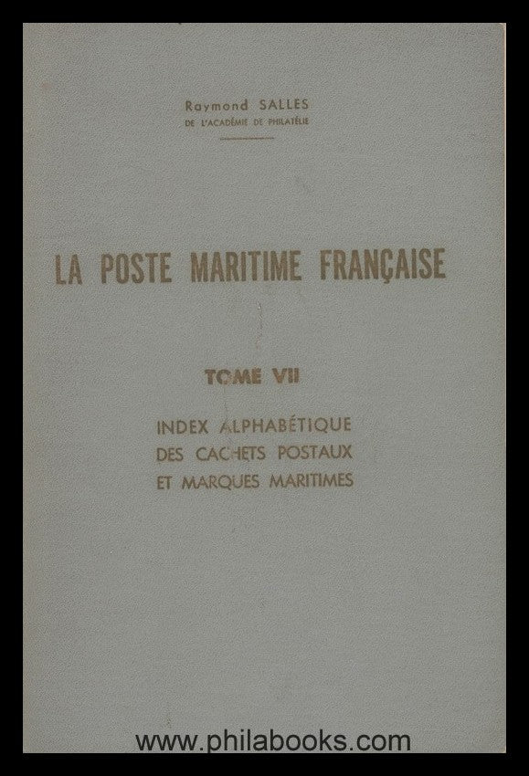 Salles, R., La Poste Maritime Francais, Tome VII, Index alphabétique des cachets postaux et marques maritimes, 1969, Originalausgabe, französische Schiffspost, Band 7, enthält ein alphabetisches Verzeichnis der Stempel mit Angaben in welchem der Bände der Stempel zu finden ist, Alters-und Gebrauchsspuren, feste Bindung. #23194