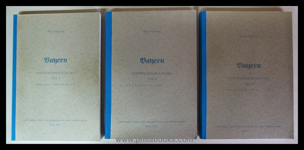 Münzberg, W., Leitfaden zur Postgeschichte und Briefkunde, Bayern, Poststationskatalog, 3 Bd., Postanstalten A-Z, Geschichte/ Postgeschichte, mit zahlr. Stempelabb. u. Karten, ca 830 S., sehr gut erhalten, komplett mit dem meist fehlenden Zusatzblatt 'Ergänzungen und Berichtigungen' #26182