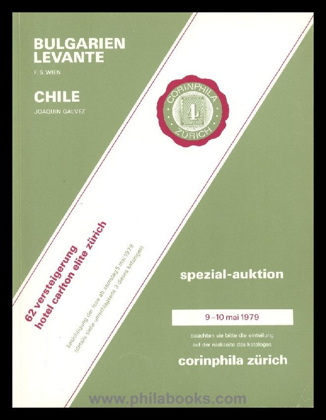 Corinphila 062. Auktion, 9.-10.5.1979, Spezial-Auktion Joaquin Galvez Collection Chile u. F.S. (Wien) Sammlung Bulgarien, Levante, Chile 628 L., Bulgarien 227 L., Levante Postgeschichte 400 L., ges. 68 s/w und 8 Farb-Tafeln, interess. u. gesuchter Kat., hier in sehr guter Erhaltung, EL #35551