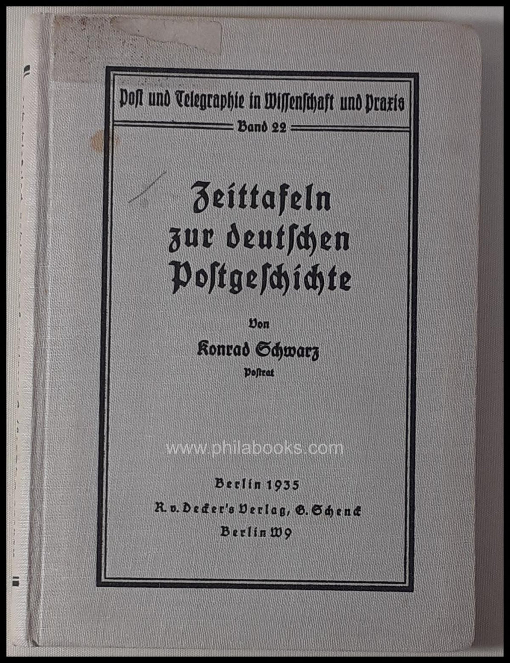 Schwarz, K., Zeittafeln zur deutschen Postgeschichte, 1935, Band 22 der guten postgeschichtlichen Reihe aus den 30er Jahren, 'Post und Telegraphie in Wissenschaft und Praxis', 215 S., Leinen, ex Postamt Goslar/ Postgeschichtliches Archiv, der Einband Gebrauchsspuren, sonst gut, sehr informativ! [Weitere Informationen unter 'Info'.] #38072