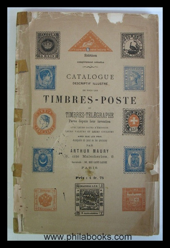 Maury, Catalogue descriptif Illustré de tous les Timbres-Poste et Timbres-Telégraphe, 1889, bekanntester französischer Alle Welt Katalog im 19. Jahrhundert, 215 S., mit dekorativem, mehrfarbigem Einband mit klassischen Briefmarken, diverse Mängel, siehe Scans #38179