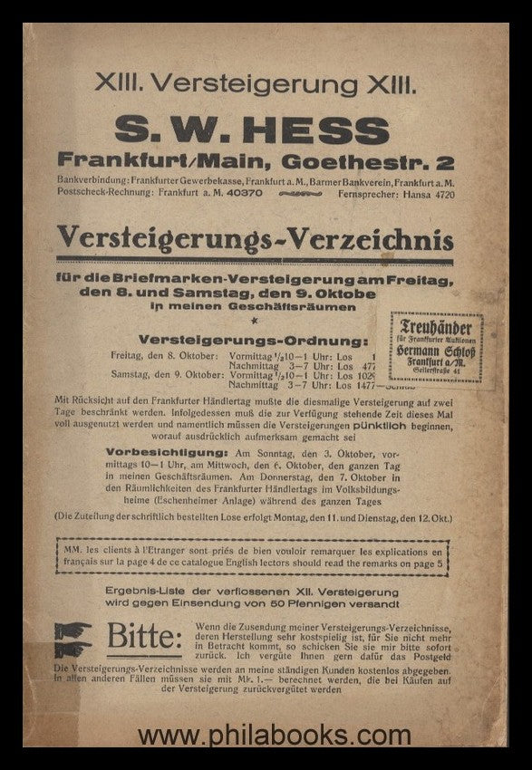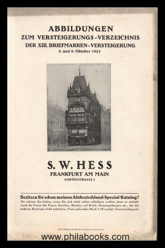 Thurn und Taxis-Spezialsammlung mit Briefen in Auktionskatalog S. W. Hess, 13. Auktion, Frankfurt/Main 08./09.10.1925, mit Aufruck auf dem Vorderumschlag 'Treuhänder für Frankfurt Auktionen Herrmann Schloß', komplett mit Fototafeln, Abb. der Thurn u. Taxis-Lose auf verschiedenen Fototafeln, meist als Ausschnitt wie seinerzeit üblich, Alters-und Gebrauchsspuren #38642