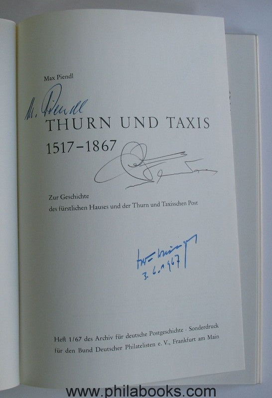 Piendl, M., Thurn und Taxis 1517-1867, Zur Geschichte des fürstlichen Hauses und der Thurn und Taxisschen Post, 1967, Sonderdruck des Archiv für Postgeschichte Heft 1/67 als Leinen-Ausgabe mit Schutzumschlag, hier eines der wenigen anläßlich der Ausstellung in Frankfurt am Main von Fürst von Thurn und Taxis sowie von Max Piendl eigenhändig signierten Exemplare, gute Erhaltung #38665