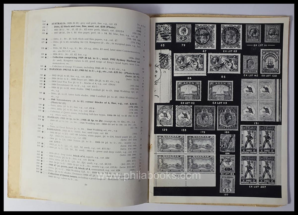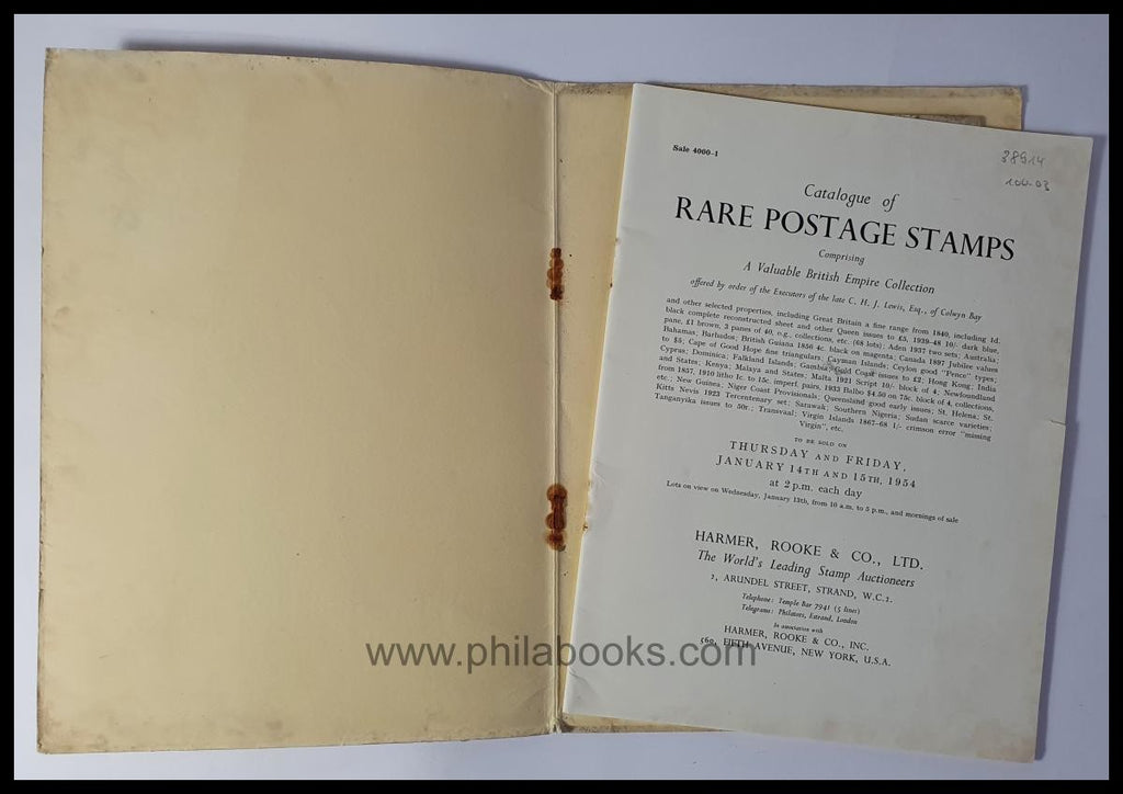 Catalogue of Rare Postage Stamps Comprising A Valuable British Empire Collection, offeres by order of the Executors of the late C.H.J. Lewis Esq. Of Colwyn Bay, Harmer, Rooke & Co Ltd., London, 14.-15.1.1954, 4000ste Jubiläumsauktion, Altersspuren, noch ein Los aus dem Garratt-Adams-Restbestand mit dem üblichen teils starken Heftungsrost, der Umschlag auch leicht wasserfleckig und der Katalog lose einliegend #38914