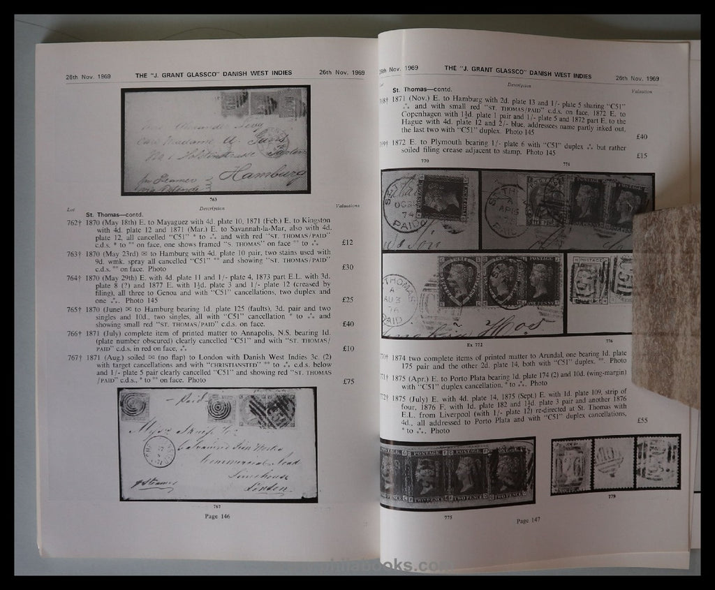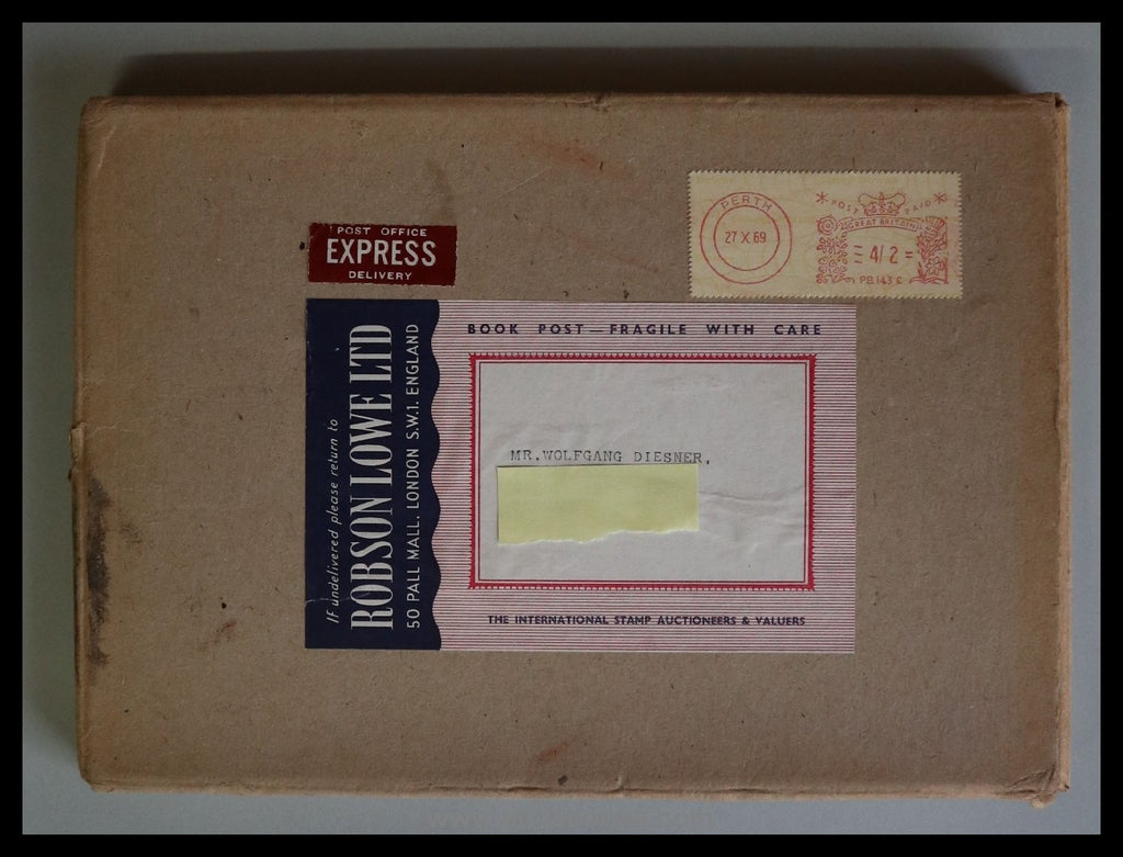 Glassco British Post Offices Abroad, Sonderauktion RL London 25.-27.11.1969, Versteigerung der legendären und bis heute unerreichten Sammlung 'Used Abroad', 1429 L. mit unzähligen S/W-Abbildungen und einigen Farbafeln, wichtiger Referenzkat. mit Hdb.-Eigenschaften, EL. Hier ein besonderes Exemplar, noch ORIGINALVERPACKT IM VERSANDKARTON adressiert an WOLFGANG DIESNER, Diesner war bekannt für seinen vorausschauenen Faible für die dokumentarische Philatelie/Philateliegeschichte, Einband geringer Einriss, sonst gute, frische Erhaltung! #39744