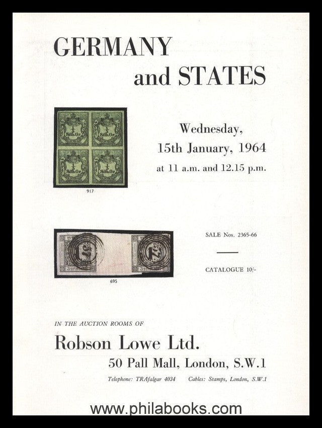 Germany and States, Robson Lowe, Auktionskat. 15.01.1964, dabei Bayern 1 Kr. Schwarz im ungebr. 45er-Block, 100 Lose Helgoland, Sachsen mit 50 Losen Sachsen-Dreier, Briefe etc.,sowie diverse bessere Briefe von anderen altdt. Staaten, ges. ca 350 Lose, EL. Interessanter und seltener Altdeutschland- Auktionskatalog! #41785
