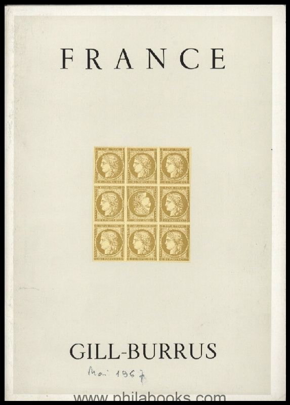 Burrus-Gill Collection France, Sonderauktion Teil II , Robineau/ Behr, Paris, 24.05.1967, Frankreich Klassik, dabei Einheiten und Belege, 360 Lose, mit zahlr. Abb. im Katalogteil sowie in dem noch separat verausgabtem Fototeil mit 23 Tafeln, Einband beschriftet 'Mai. 1967', sonst gut erhalten, mit EL. General Robert Gill hatte einige Jahre zuvor wichtige Teile der Burrus Frankreich-Sammlung erworben, die teilweise ursprünglich Teil der Sammlung Ferrari waren #42099