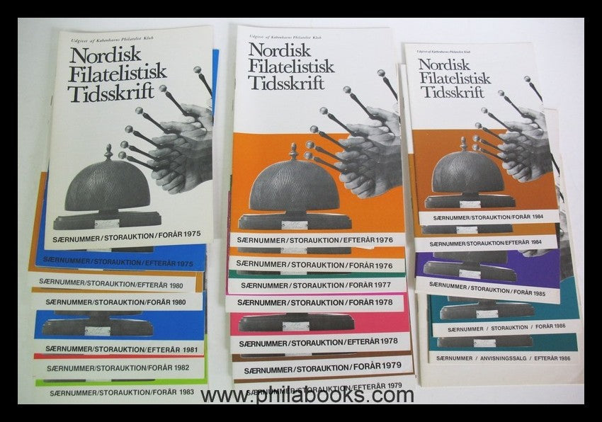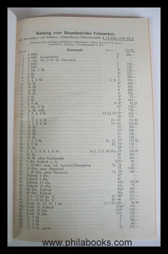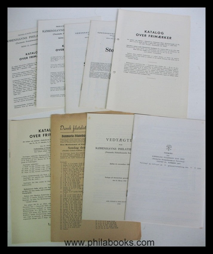 Katalog over Skandinaviske Frimaerker, Auktionslisten des Kopenhagener Philatelistenklubs, beginnend ab Liste 13.2.1930, dann Liste 10.4.1930, dann 'Katalog I' usw., ca noch weitere 30 Listen bis 1960, ohne Abb., broschiert gebunden. Darin auch 'Ingenior W. Thomsens Samlinger' sowie noch 30 spätere Auktionslisten bis ca 1987, diese broschiert und lose beiliegend. #42626