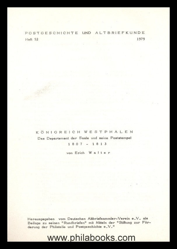 Walter, E., Königreich Westphalen. Das Departement der Saale und seine Poststempel 1807-1813, 20 S., DASV Beilage, Heft 52, 1979 #42782