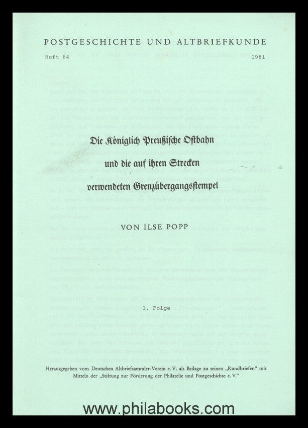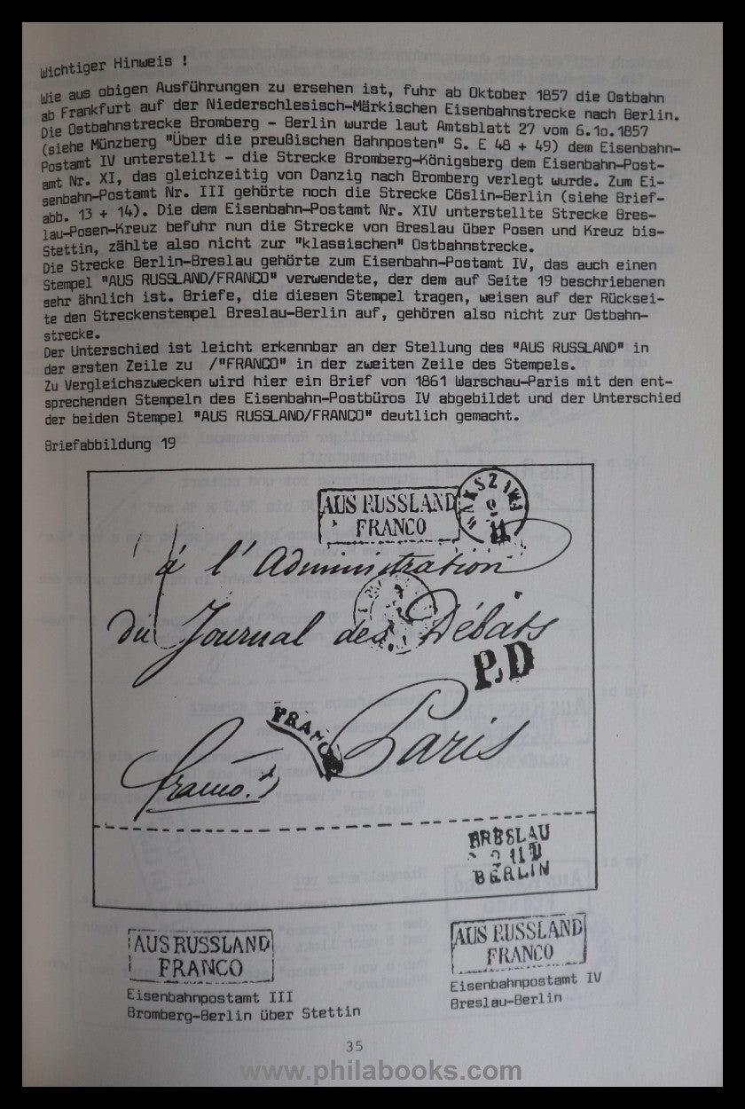 Popp, I., Die Königlich Preußische Ostbahn und die auf ihren Strecken verwendeten Grenzübergangsstempel, Teil I u. II komplett, zus. 75 S., mit Beleg-Abb., Karten und Fahrplänen, erschienenen als DASV-Beilage Postgeschichte und Altbriefkunde He. 64/65, 1981, dabei insbesondere Briefe 'aus Russland' #42793