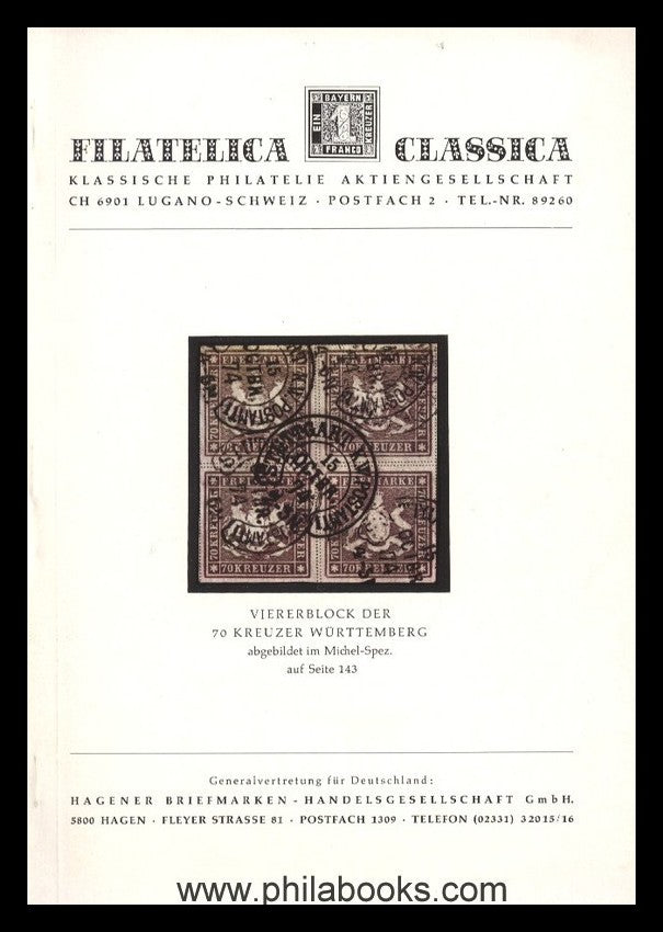 Filatelica Classica, Klassische Philatelie Aktiengesellschaft, Lugano Schweiz, hochwertige Festpreiskatalog aus Mitte der 1960er Jahre von Briefmarken der Altdeutschen Staaten, Schweizer Ableger der schillernenden Hagener Briefmarken-Handelsgesellschaft mit für die Zeit sehr aufwendigen guten durchgängige farbigen Abbildungen, 71 S., interessanter Katalog in guter Erhaltung! #44562