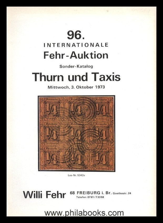 Fehr, 96. Internationale Auktion, Sonderkatalog Thurn und Taxis, Freiburg, 03.10.1973, 1200+ Lose, mit Abb. auf 20 s/w-Tafeln und 2 Farbtafeln, sowie einigen Abb. im Textteil, #44581