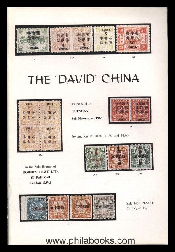 Lowe, R., The 'David' China Specialised Stamp Sale, London, 09.11.1965, 750 Lose, diverse Abb., hier in guter Erhaltung, kpl. mit EL, wichtiger Referenzkatalog der bedeutenden Sammlung! #44610