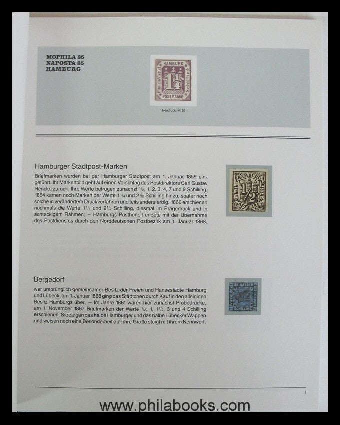 Naposta/Mophila 85 Hamburg, Ausstellungskatalog 114 S., enthält 11 Hamburg Neudrucke im Prägedruck der Ganzsachen-und Postanweisungs-Wertstufen sowie einen Faksimile-Druck des 9 Kr. Baden-Fehldruckes auf Brief #45115