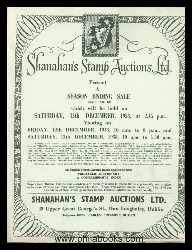 Shanahan Auctions, Dublin Sale No. 81, 13.12.1958 mit interess. Angebot ganzer Bögen, u.a. von Hamburg, Helgoland, Deutsches Reich Brustschilde, Deutsche Post in China usw., klass. Marken diverser Länder und sehr gutes Angebot Toskana sowie Foto-Impressionen von der November-Auktion, nur leichte Gebrauchsspuren, fast gut erhalten, bei Shanahan selten wegen der dünnen Papierumschläge #45417