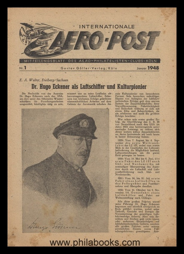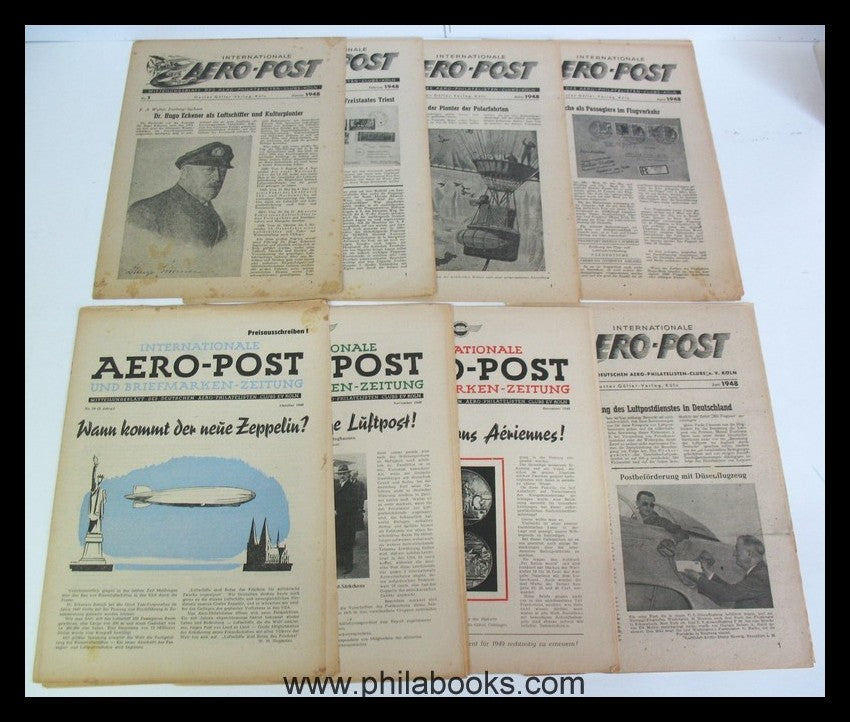 Internationale Aero-Post, Mitteilungsblatt des Aero-Philatelisten-Clubs-Köln, Nr. 1-4 Januar 1948- April 1948, Nr. 6 Juni 1948 sowie Nr. 10-12, Oktober-Dezember 1948, gesamt 7 Ausgaben, teils an den Rändern etwas papierfleckig. Hoch-interessante Nachkriegeszeitschrift mit aktuellen Meldungen über die Entwicklung und den Anschluss Deutschlands an den Weltluftpostverkehr, Besuche von Dr. Eckener in den USA, die 'neue deutsche Luftpost', Ideen zur Wiederbelebung des Zeppelinverkehrs, mit Abbildungen. Zeitdokument. Sehr seltene Zeitschrift, vorliegender Bestand ist das Ergebnis ein mehrjährigen intensiven Suche! #45614