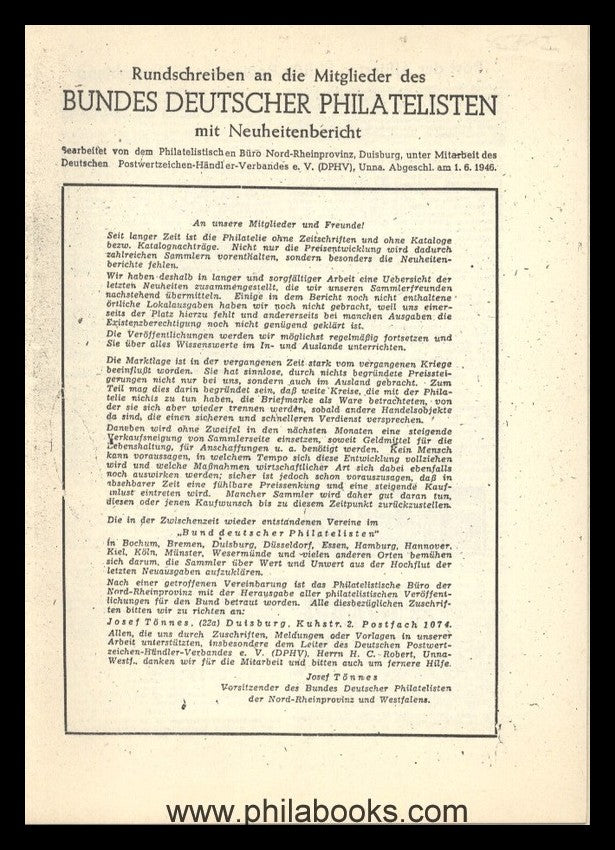 Rundschreiben an die Mitglieder des Bundes Deutscher Philatelisten mit Neuheitenbericht, Unna, 1.6.1946, erstes Rundschreiben des BDPh, hier als Kopie, 24 S., darin Katalogisierung der Ausgaben 1944-46 von Deutschland und Österreich, mit Abb. #45812