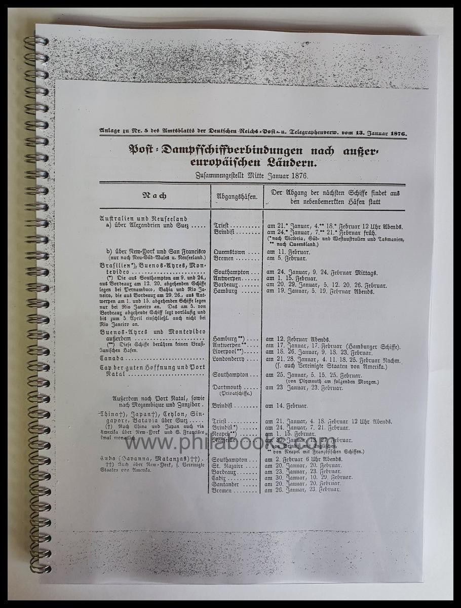Post-Dampfschiffverbindungen nach außereuropäischen Ländern, Anlage zum Amtsblatt, hier ein Kopiensatz aller 24 im Jahr 1876 erschienen Listen. Nach Destinationen gelistet mit Abgangshäfen-und Daten, Originale sehr selten, 72 S., broschiert #46229