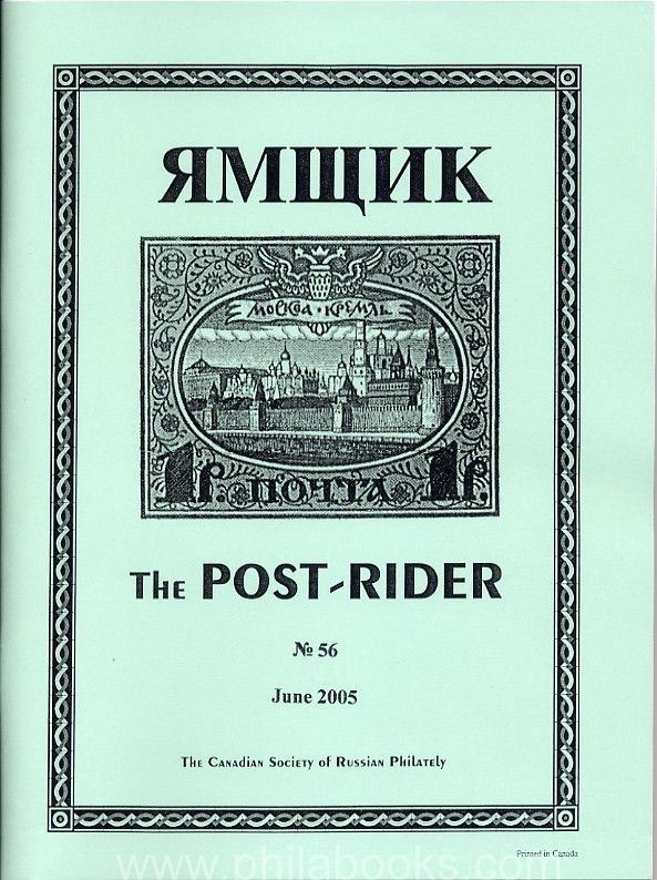 Post-Rider, Journal of the Canadian Society of Russia Philately, No. 56 June 2005, 120 S., enthält zahlr. interess. Beiträge zu allen möglichen Bereichen der Russland Philatelie und Postgeschichte, viele Abb., Text meist engl. #47015