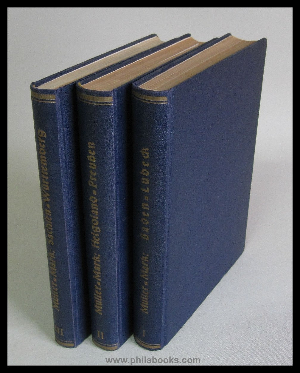 Müller-Mark, Altdeutschland unter der Lupe, 4..Auflage, Baden bis Württemberg komplett geb. in 3 blauen Originaleinbänden mit Rückenprägung, 1010 S., mit zahlr. Abb. und Faksimile-Beigaben und mit Bewertungsangaben, Papier wie meist gebräunt, ansonsten gut erhalten mit nur geringen Alters-und Gebrauchsspuren. #47617