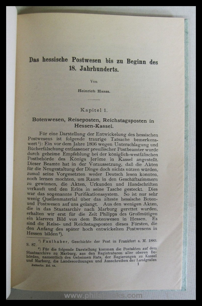 Haass, Heinrich: Das hessische Postwesen bis zu Beginn des 18. Jahrhunderts, (Inaugural-Dissertation zur Erlangung der Doktorwürde der Hohen Philosophischen Fakultät der Universität Marburg), hier einmal als Original, undatiert (ca 1890), nicht der Reprint, 108 S., sauberes Ex. mit geringer Papierbräunung, neu gebunden #49373