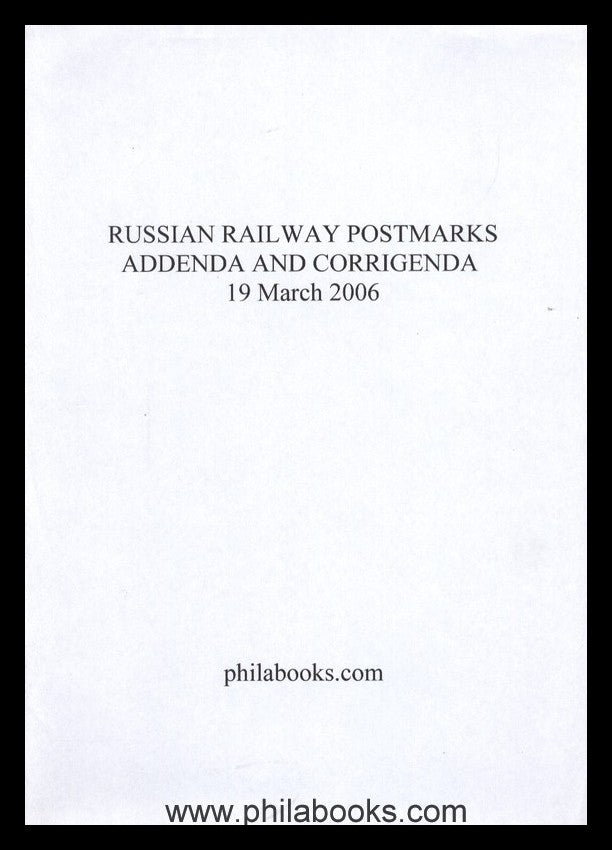 Kiryrushkin/Robinson, Russian Railway Postmarks. Addenda and Corrigenda.19 March 2006. Komplettes Update zu dem Stempelkatalog von 1994. Enthält in Tabellenform alle neu registrierten Stempel, mit Angbaben zur Größe, Verwendungszeit und Seltenheit, 81 S., ohne Abbildungen, ungebunden #49407