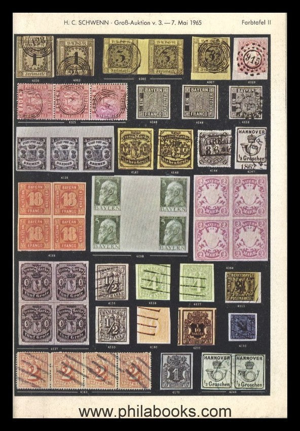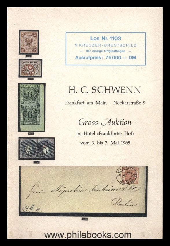 Schwenn, H.C. Frankfurt am Main, Gross-Auktion, 03.-07.05.1965, Katalog der 1. Schwenn-Auktion, hier ein Exemplar eines Auktionsteilnehmers mit fast durchgängig mit Bleistift mit notierten Ergebnissen. Enthält auch noch einige weitere interessante Notizen wie z.B. beim Los Nr. 1103/ 9 Kreuzer Brustschild - der einzige Originalbogen 'im Saal 86.000.-, Telefon bis 99.000, 100.000 (Auktionsaal)', komplett mit denen zum Katalog gehörenden Fototafeln 'Farbtafel II-Tafel 88', die Ankündigungsbroschüre für die Auktion sowie der äußerst seltene 'Ergebnisbericht' mit einem Auszug der Ergebnisse sowie einem Foto aus dem Auktionssaal, alles gut erhalten, in dieser Vollständigkeit interessante und seltene Dokumentation. #49741