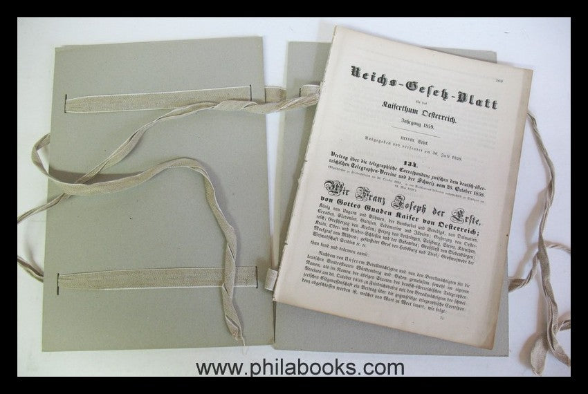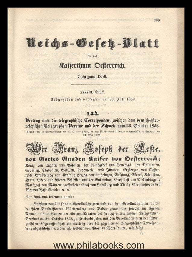 Vertrag über die telegraphische Correspondenz zwischen dem deutsch-österreichischen Telegraphen-Vereine und der Schweiz vom 26. October 1858, aus Reichs-Gesetz-Blatt für das Kaiserthum Oesterreich, Jg. 1859, 16 S., Orig., ungeb. in Archivmappe #50397