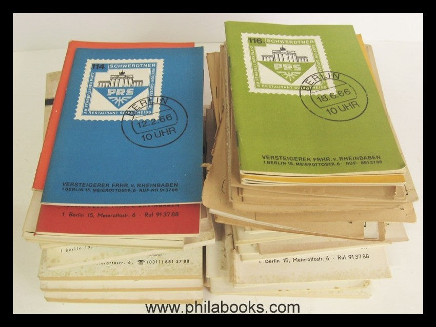 Schwerdtner-Briefmarken-Auktion, Berlin Charlottenburg, Inhaber Hans v. Rheinbaben, ab Auktion Nr. 119 A. Mathis, hier ein Konvolut von ca 70 Katalogen ab Nr. 2 (29.05.1948) bis Nr. 123 (1967), dabei Nr. 2-8, 15, 25, 27, 29, 30, 32-4, 37-41, 44, 46, 48-9, 52-3, 81, 83-108, 110-123, die älteren teils mit Ergebnislisten, einige aussen etwas papierfleckig, interessante Kataloge #50409
