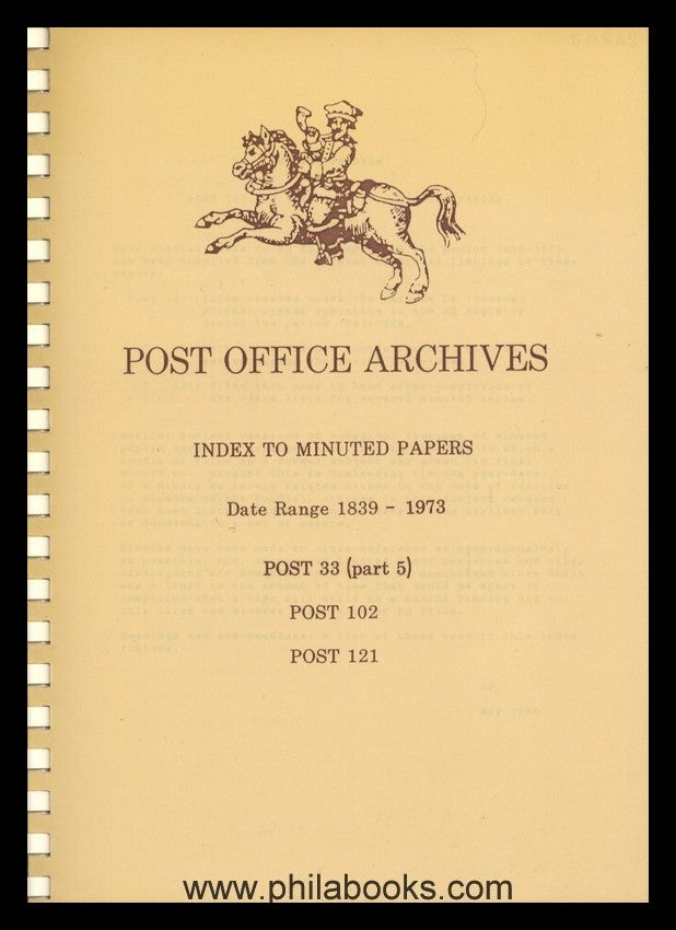 Post Office Archives, Index to Minuted Papers, Date Range 1839-1973, Post 33 (part 5), Post 102, Post 121, 1986, 108 S., Archiv-Verzeichnis. #50568