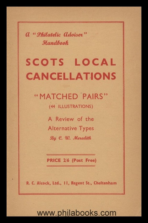 Meredith, C.W. : Scots Local Canellations, 'Matched Pairs', 44 Illustrations, A Review of the Alternative Types, R.C.. Alcock, Cheltenham, ca 1955, 8 S. #50573
