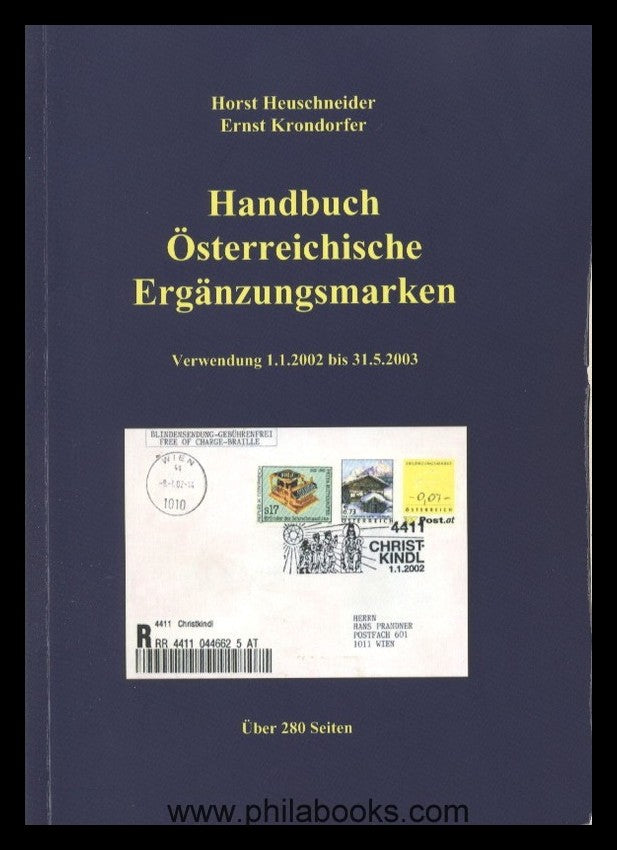 Heuschneider, Horst/ Krondorfer, Ernst: Handbuch Österreichische Ergänzungsmarken. Verwendung 1.1.2002 bis 31.5.2003, 2007, Spezialkatalog für die bei der EUR-Einführung in Österreich verwendeten sogenannten Ergänzungsmarken, 288 S., mit Bewertungen. Enthält zahlreiche Belegabb., auch Plattenfehler-Vergrösserungen etc., #52687