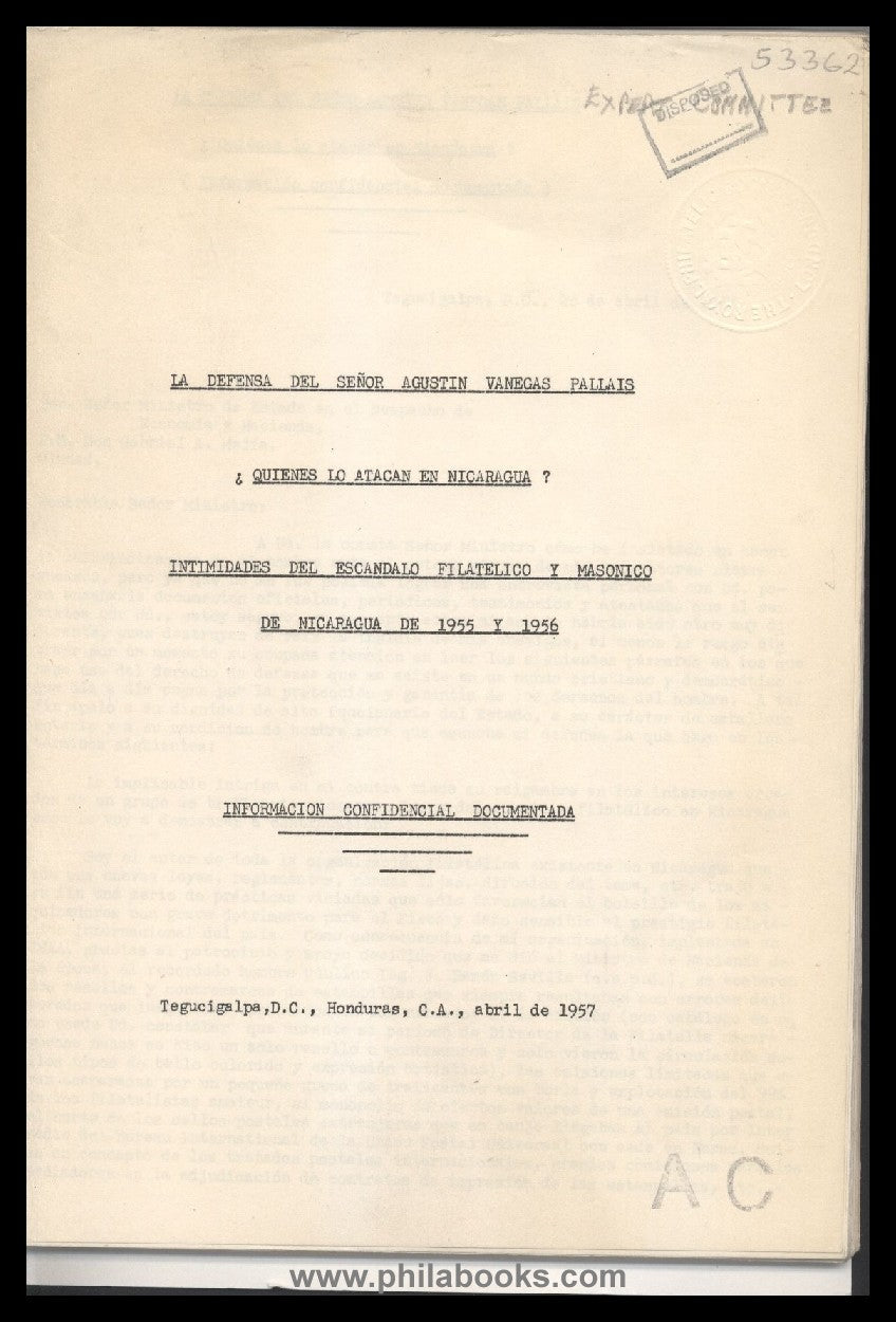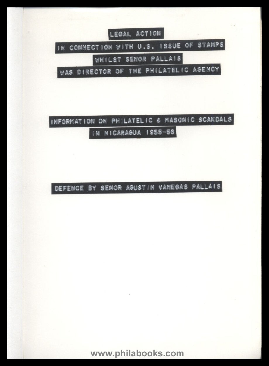 Legal Action in Connection with U.S. Issue of Stamps whilst Senor Pallais was Director of the Philatelic Agency, Information on Philatelic & Masonic Scandals in Nicaragua 1955-56, Defence by Senor AgustinVanegas Pallais, Honduras, 1957, 32 S., Text span. #53362