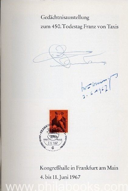 Thurn und Taxis, Katalog zur Gedächtnisausstellung zum 450. Todestag Franz von Taxis, Frankfurt 4. bis 11. Juni 1967, ca 30 S. mit Abb., hier ein besonderes Ex. mit eigenhändigen Unterschriften von Franz Joseph Fürst von T.u.T. und Dr. Werner Dollinger. #53936