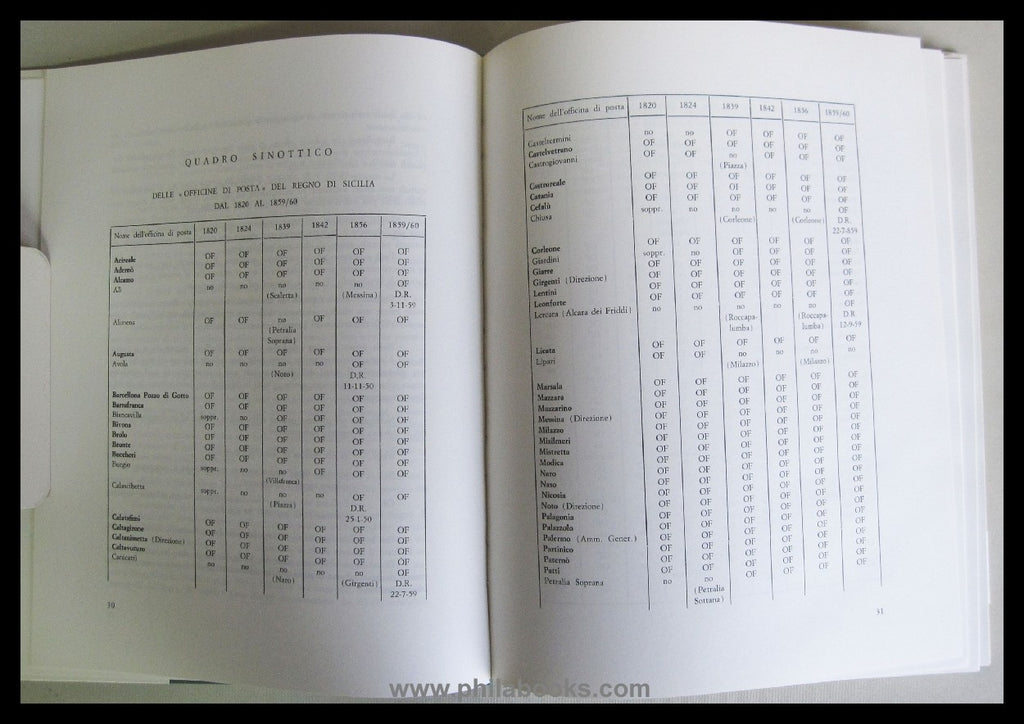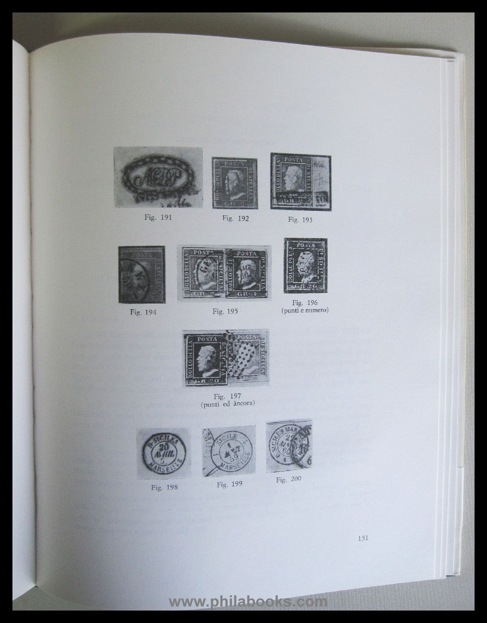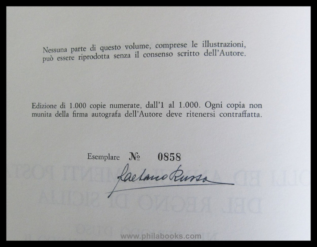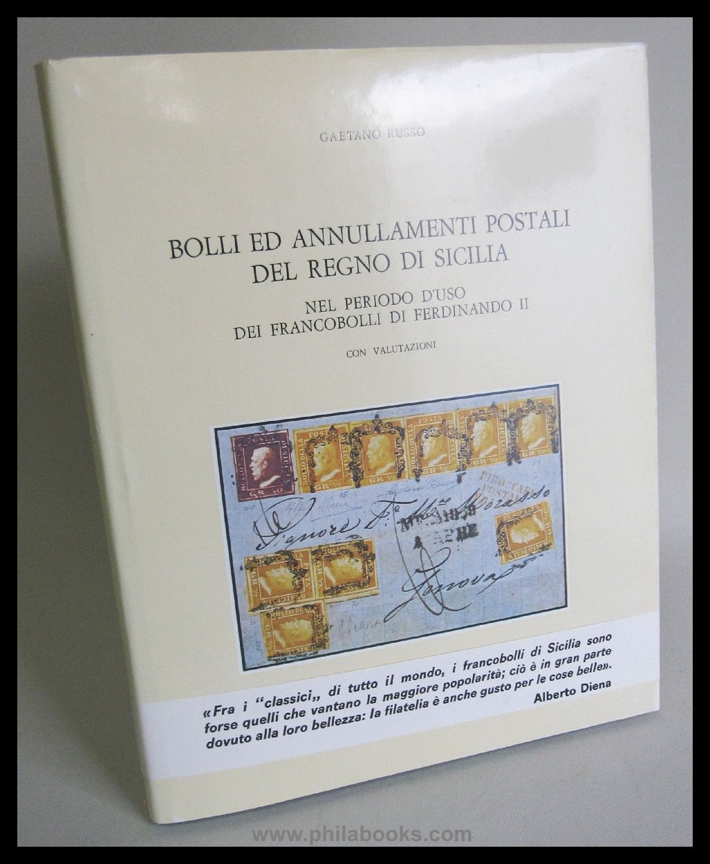 Russo, Gaetano: Bolli ed Annullamenti Postali del Regno di Sicilia, nel periodo d'uso del francolbolli di Ferdinando II, con valutazione, 1968, Ex. 858/1000, signiert, 218 S., Postgeschichte, Postorte und Stempel während der kurzlebigen Ausgabe von 1859, mit Abb. u. Faltkarte, im Original-Pappschuber, sehr gut erhalten #55561