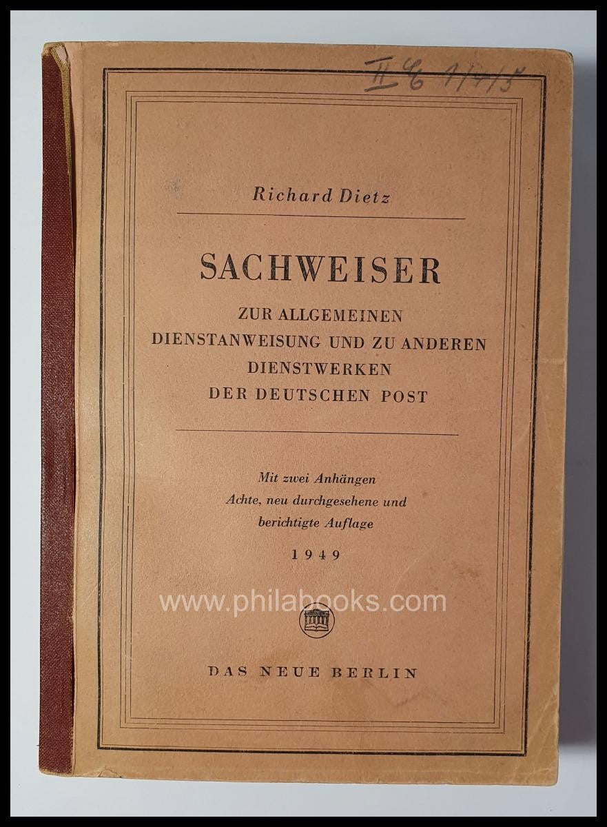 Dietz, R., Sachweiser zur allgemeinen Dienstanweisungen und zu anderen Dienstwerken der Deutschen Post. Mit zwei Anhängen. Achte, neu durchgesehene und berichtigte Auflage, Das Neue Berlin, Berlin, 1949, broschiert, 629 S., Papier gebräunt, Einband leichte Gebrauchsspuren, sonst ordentlich Erh. #55862