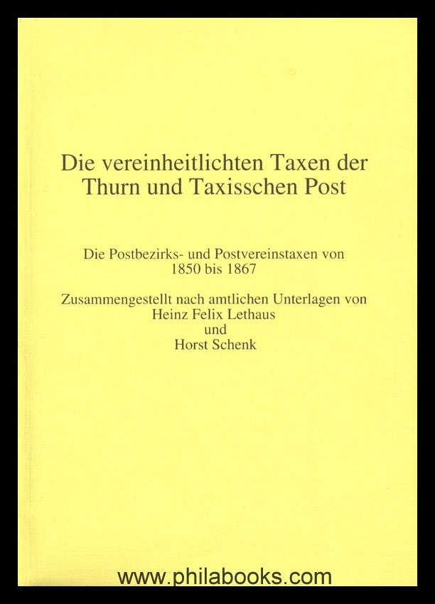 Lethaus/Schenk, Die vereinheitlichten Taxen der Thurn und Taxisschen Post, Die Postbezirks-und Postvereinstaxen von 1850 bis 1867, zusammengestellt nach amtlichen Unterlagen, o.J. (ca 1998), Erstauflage, seinerzeit nur privat und nicht über die Arge Thurn-und Taxis vertrieben, kleine Auflage! 102 S., #56234