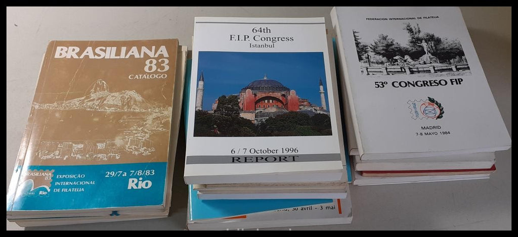 Federation Internationale de Philatelie, Annuaire 1938, 117 S., hier ein gutes Exemplar sowie auch noch die FIP Berichte 49-53 und 64-65, einige mehrfach oder mehrteilig, insgesamt 19 Kataloge, ex Paolo Vollmeier, nicht häufig angeboten #56811