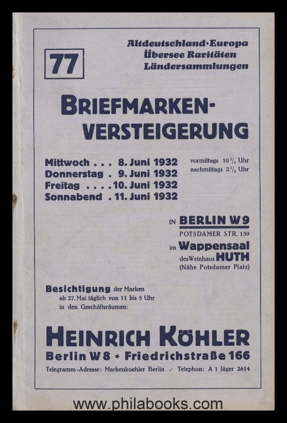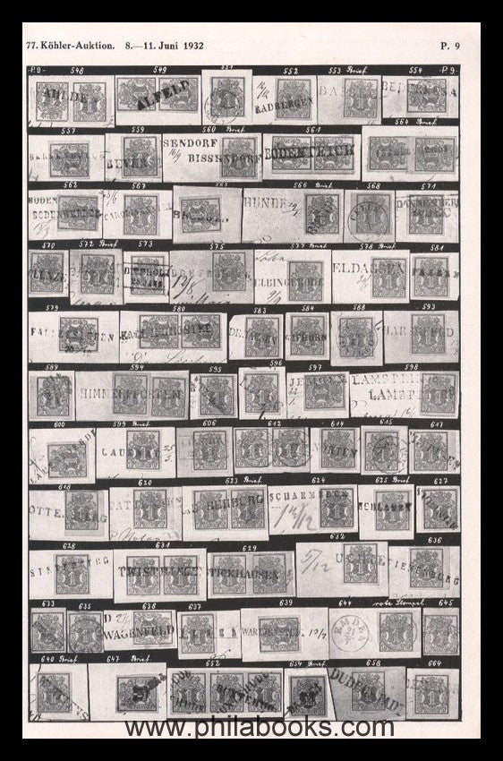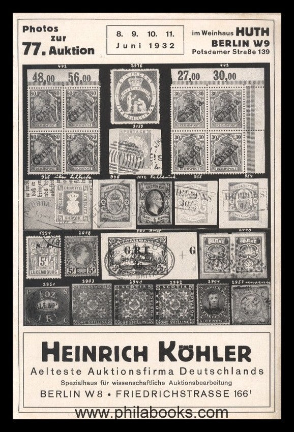 Köhler, Heinrich, Berlin, 77. Briefmarken-Versteigerung, 08.-11.06.1932, Auktionskatalog kpl. mit Fototafeln, 3518 L., 28 Tafeln, dabei besonders erwähnenswert Hannover Abstempelungen aus Spezialsammlung, Braunschweig und Oldenburg Stempel, Österreich mit Lombardei und insbesondere Schiffspoststempel, Sizilien #57315