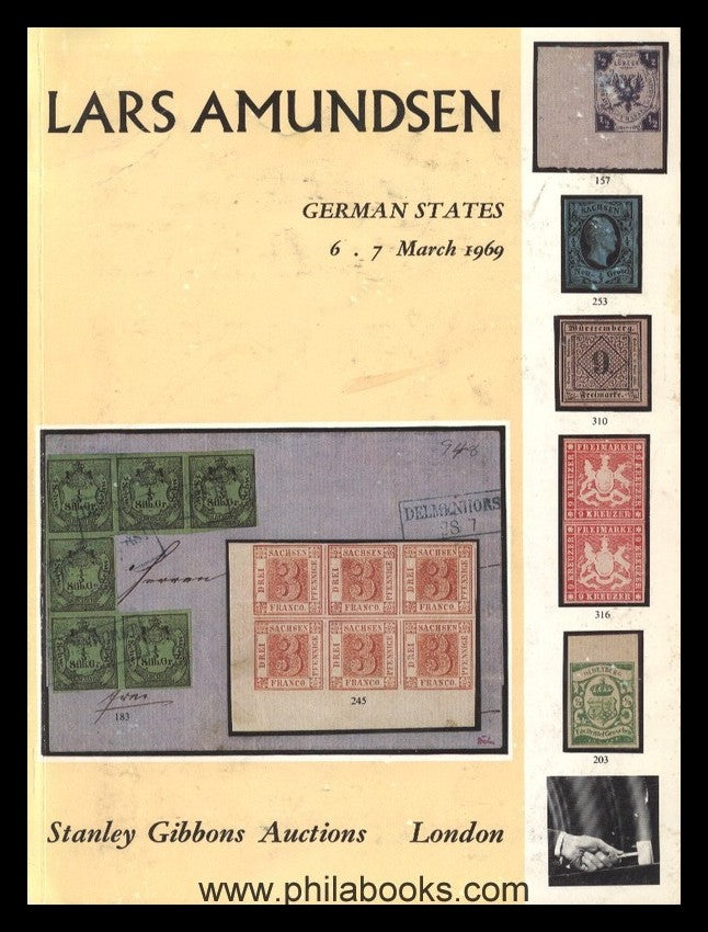 Amundsen Collection German States, Sonderauktion Stanley Gibbons London, 6.-7.3-1969, gut erhalten, mit EL, 356 Lose mit Briefen u. Einheiten u.a. Oldenburg 1/3 Sgr. im 6er 'Block' auf Brief aus Delmenhorst, Sachsen-Dreier Streifbänder (2) u. ungebr. 6er-Block, Württemberg 70 Kr. im 6er-Block gebr. und zahlreiches weiteres eindruckvolles Altdeutschland-Material, wichtiger Referenzkatalog mit teils farbigen Abb., #57385